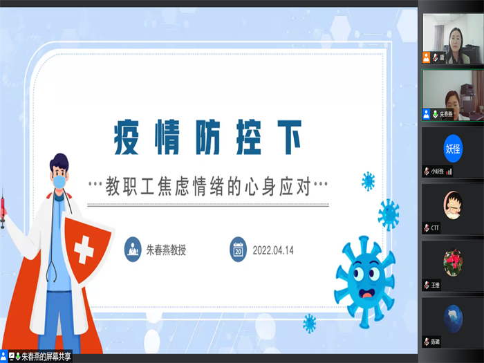 4月14日,校教职工心理健康服务中心邀请PA视讯副经理朱春燕教授,以“疫情时期的焦虑情绪应对”为主题,为全校职工开展了一场线上公益讲座,提醒广大教职工做好“心理防疫”。全校500余名教职工线上参加活动。